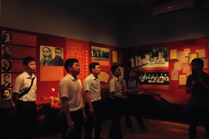 ?? 團一大紀念廣場上,約50名團員青年代表佩戴團徽,莊嚴地舉起右手,重溫入團誓詞。團一大史跡展覽館中,大家通過“歷史的選擇”、“東園起春潮”、“偉業的召喚”和“青運開新篇”四個篇章,回顧共青團的光輝歷程,緬懷革命先輩的偉大業績。