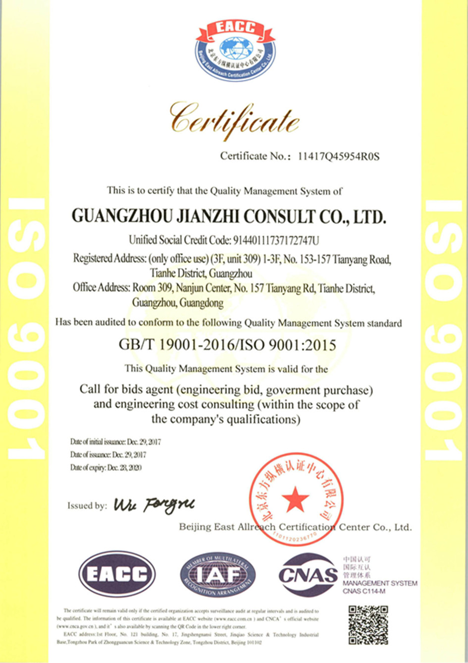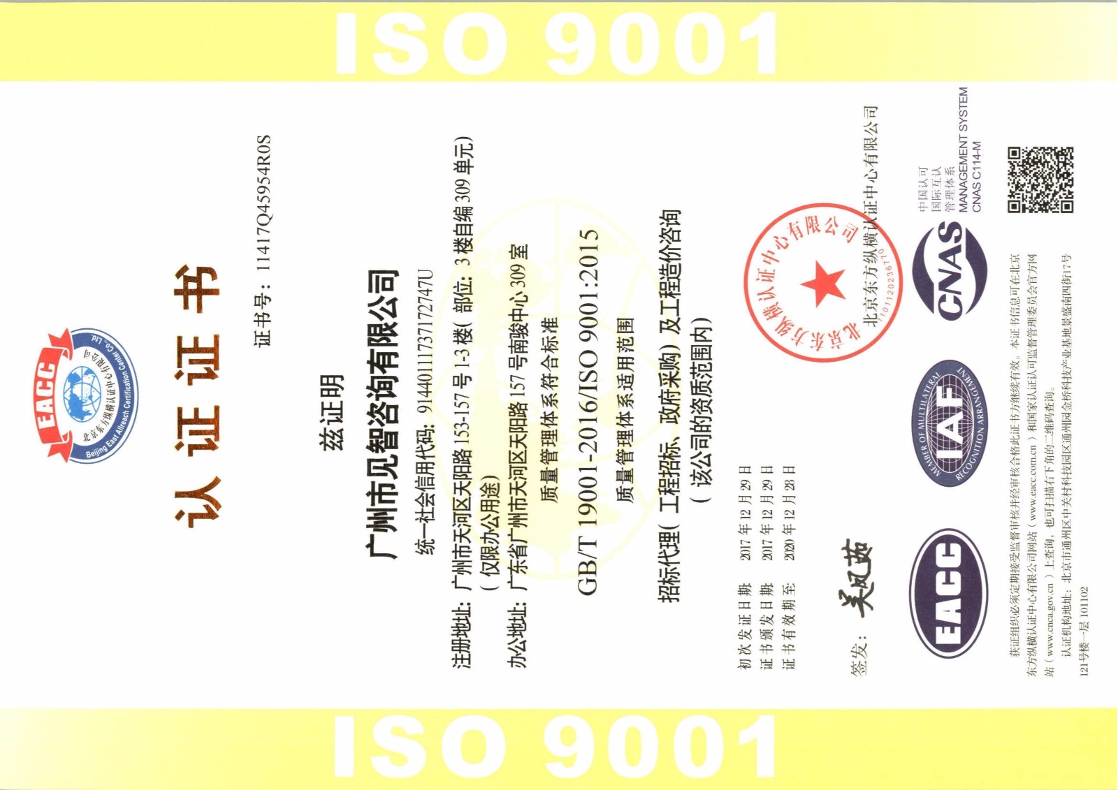 近日,廣州市見智咨詢有限公司順利通過質量管理體系認證審查,針對我司所從事的招標代理(工程招標、政府采購)及工程造價咨詢進行了審核,在公司全體員工的共同努力下,我司以完善的管理體系和嚴謹的服務措施順利通過了GB/T 19001-2016 /ISO 9001:2015質量管理體系認證,并榮獲EACC(北京東方縱橫認證中心有限公司)頒發的證書。